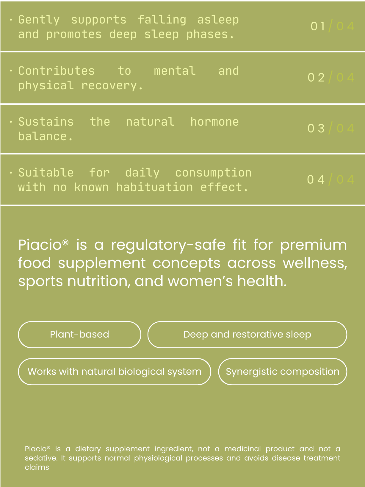 One ingredient platform. Three high-value applications. Piacio® brings plant-based sleep and regeneration to women’s health, sports nutrition, high-performance, and travel wellness.